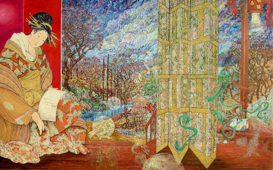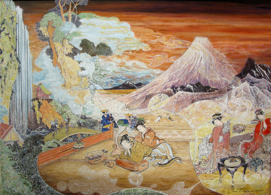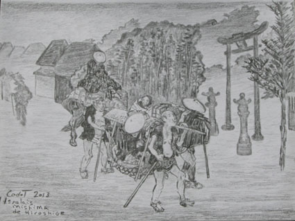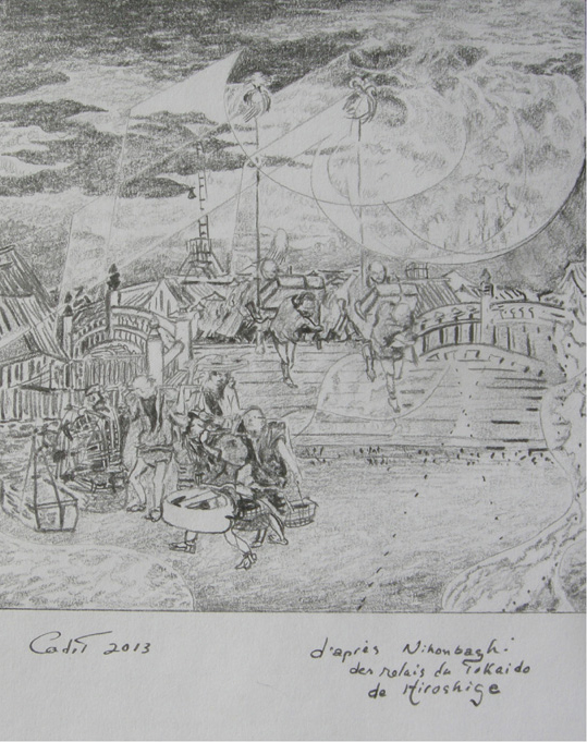 Mon cheminement personnel m’avait amené par le passé à m’intéresser particulièrement à l’ukiyo-e. Déjà un projet antérieur, Rencontre, portant sur une imbrication d’oeuvres de grands maîtres, m’avait permis de relier par exemple Utamaro (Les amants au balcon) à Manet (Le déjeûner sur l’herbe), ou Hokusai avec Géricault et Ucello, ou bien sûr Hiroshige avec Van Gogh. Ce jeu d’appariement m’avait déjà quelque peu familiarisé avec l’univers de l’ukiyo-e, puis, lors d’un voyage au Japon, les visites des musées de l’ukiyo-e de Matsumoto, ou Hiroshige de Ena, et du Tokaido de Yui (Shizuoka), ont encore plus alimenté ma profonde fascination pour cette forme d’art, et j’ai alors décidé de poursuivre une petite série d’études et interprétations comportant une quinzaine de dessins et peintures. On y retrouvera particulièrement quelques études au crayon de mine évoquant certains relais du Tokaido de Hiroshige, quelques interprétations de portions d’oeuvres de Utamaro, ainsi que de Suzuki Harushige, Yoshitoshi Tsukioka, ou Isoda Koryûsai. Ce fut avec une joie immense que j’ai pu en quelque sorte chercher à m’initier à leurs manières et observer la puissante harmonie avec laquelle ils élaborèrent leurs oeuvres. Ce projet, Hommage à l’ukiyo-e, pourrait ne jamais s’arrêter, ou du moins s’immiscer à sa manière dans tout autre projet subséquent, comme si ce voyage-là dans l’univers du monde flottant relevait de rencontres à tout jamais inoubliables.
