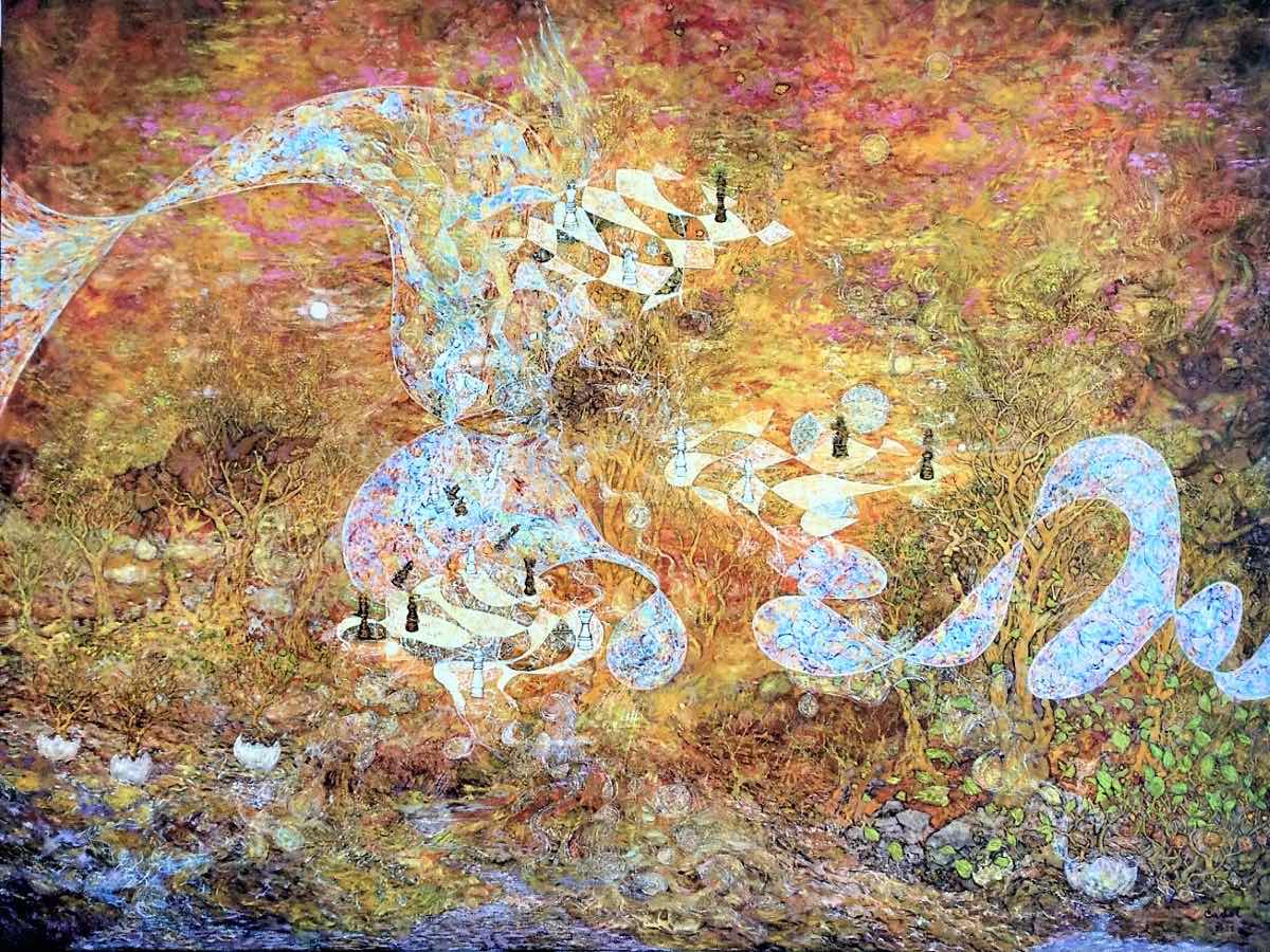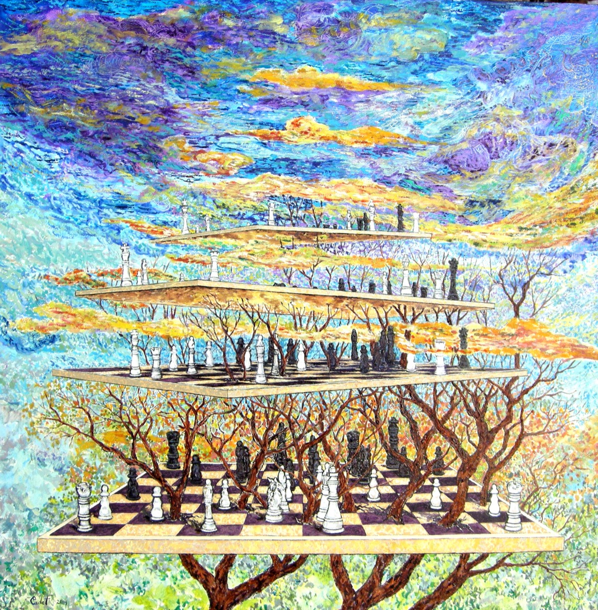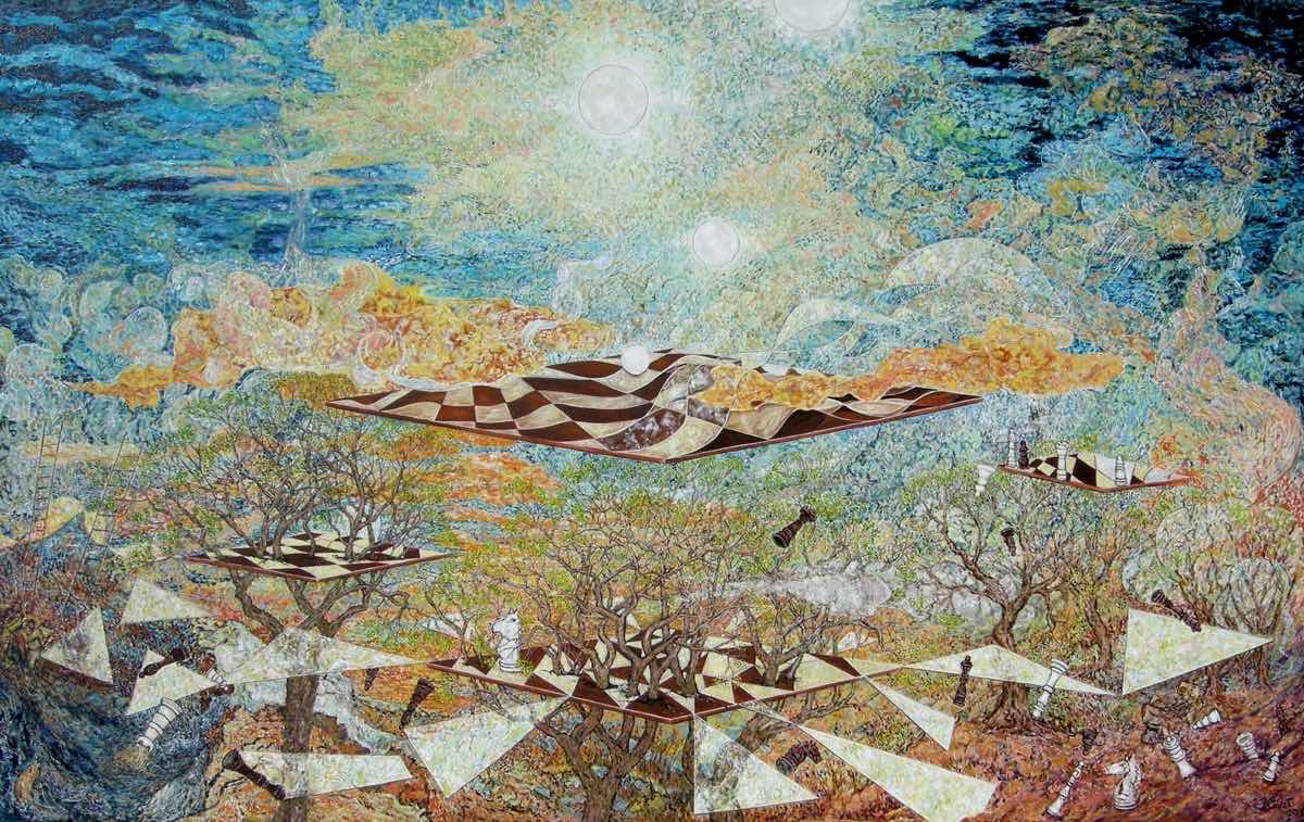 J’imagine pour ma part un jeu suspendu, hissé dans les branches d’un arbre. Les joueurs ne seraient peut-être que d’un seul camp, ou bien alors ce jeu jouerait tout seul parfois, par impulsions aussi naturelles que magiques, pour le seul plaisir de voir les pièces se mouvoir, en narguant peut-être bien la logique même du temps qui passe, l’alternance des saisons, celle du jour et de la nuit, aux heures devenues incertaines. Vie et mort, blanc ou noir, ce qui est en haut ou en bas, tout cela serait alors devenu flou. Dans ce jeu-ci les pièces prises tomberaient des branches comme des feuilles, ou flotteraient parfois au vent. Le sens de la légèreté leur serait alors octroyé comme à des personnages redécouvrant qu’ils peuvent avoir des ailes, et sortir enfin du jeu. L’échiquier lui-même pourrait parfois étirer des lignes devenues flottantes, histoire de les rendre moins carrées. Calculs et avancées sont ainsi projetés dans un monde d’ondes et particules, ou la seule victoire qui puisse compter serait celle de l’harmonie.